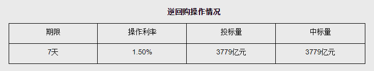 4月25日,央行公告以固定利率、数量招标方式开展了1595亿元逆回购操作,期限为7天,操作利率为1.50%,投标量和中标量均为1595亿元。