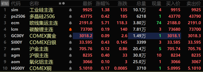 此外,氧化铝涨0.1%。碳酸锂涨0.19%,工业硅涨1.38%。多晶硅主力期货涨0.42%。