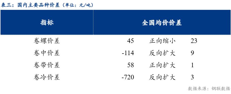 从品种价差来看,卷螺差较上一交易日正向缩小23元/吨,热中价差较上一交易日反向扩大9元/吨,热带价差较上一交易日正向扩大1元/吨,热冷价差较上一交易日反向扩大3元/吨。