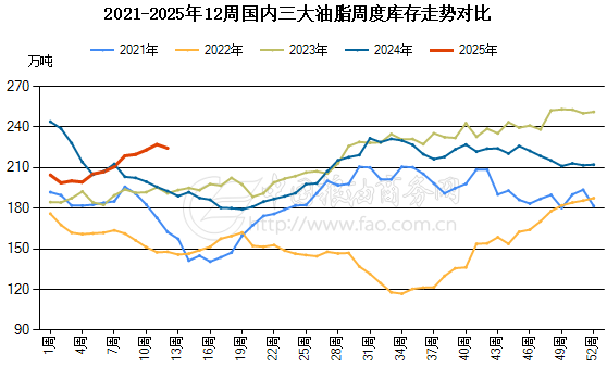 (4)国内方面,油脂库存依然高企。粮油商务网数据显示,截止到2025年第12周末,国内三大食用油库存总量为224.37万吨,周度环比下降2.76万吨,同比增加16.46%。