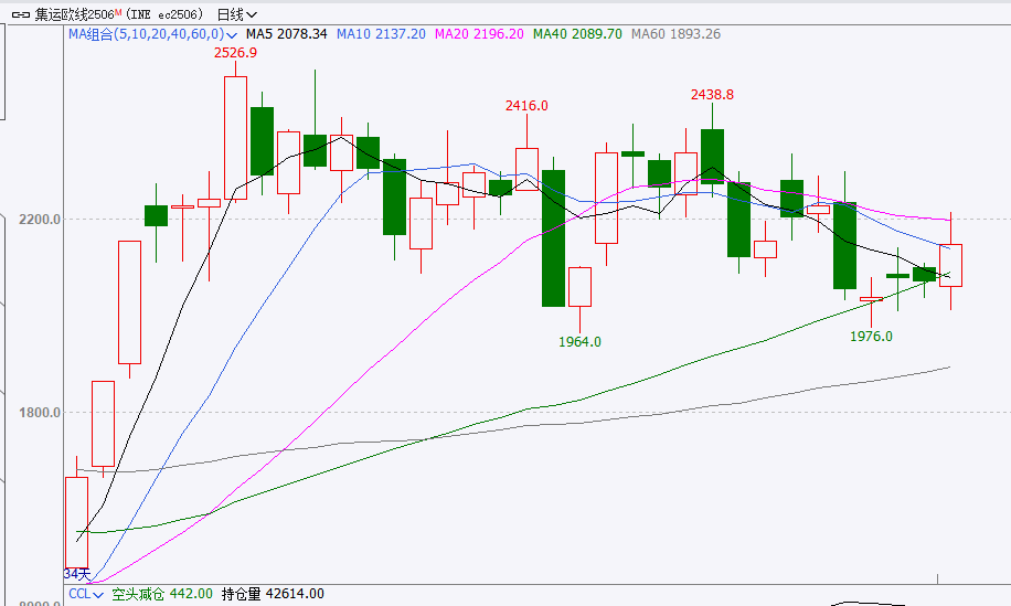市场多空因素交织,双方交战激烈,看涨情绪支撑下,集运指数午间收盘前大幅拉涨,但午后略有回落。最终主力EC2506合约收于2146.8点,涨幅为3.58%。