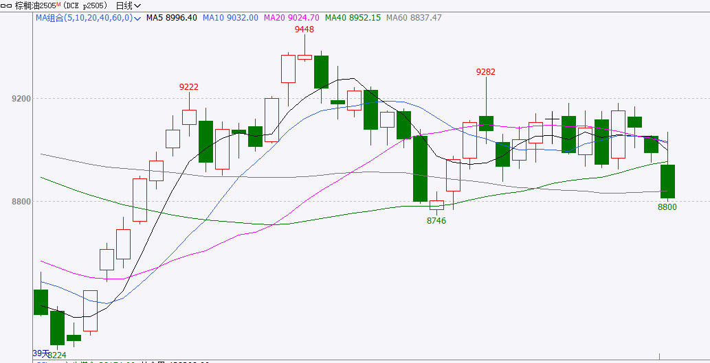南亚棕榈油产量增长明显,但出口数据依旧疲软,导致今日棕榈油盘面出现较大幅度调整。截至今日收盘棕榈油主力2505合约报收8812元/吨,日跌186元/吨,跌幅达2.07%。