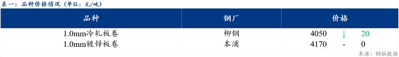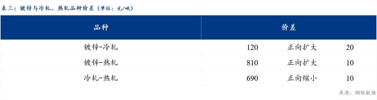 今日冷轧板卷乐从与天津价差较上一交易日收窄10元/吨,乐从与上海价差较上一交易日扩大20元/吨;镀锌板卷乐从与天津价差较上一交易日持平,与上海价差较上一交易日持平。品种价差方面,镀冷价差较上一交易扩大20元/吨,镀热价差较上一交易日扩大10元/吨,冷热价差较上一交易日收窄10元/吨。