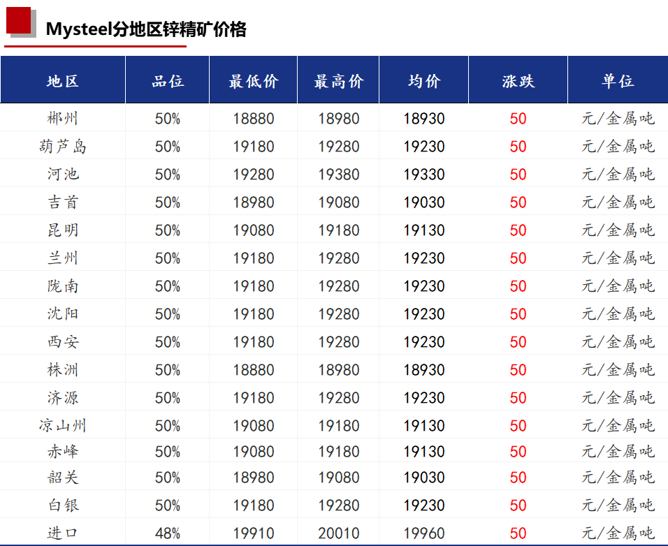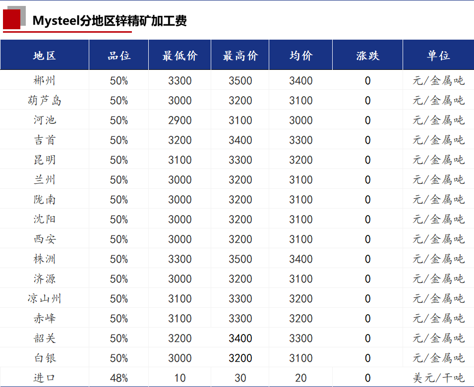 今日受锌价的影响,锌精矿价格上涨50元/金属吨。国内锌精矿加工费各地区均未调整,和上一交易日持平。进口TC市场主流报价在10-30美元/干吨,暂无波动。