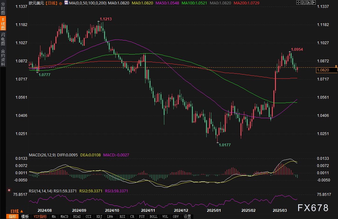 汇通财经APP讯——周二(3月25日),欧元兑美元在亚洲时段企稳于1.0780附近后,欧洲早盘回升至1.0820上方,日内涨幅0.17%。尽管市场对欧洲央行4月降息的预期升温,但美元指数从两周高点104.50回落至104.00下方,为欧元提供了喘息空间。当前报价1.0818,技术面显示均线系统形成多层支撑,但需警惕特朗普关税言论与欧美政策分化带来的波动。