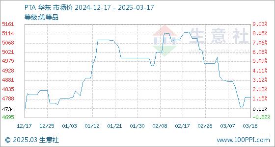 3月17日,生意社PTA基准价为4797.45元/吨,与本月初(4967.27元/吨)相比,下降了-3.42%。