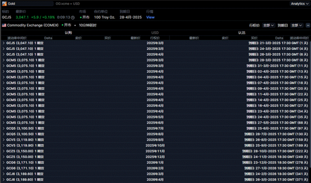 当前芝商所推出的黄金(OG)期权上市时间表的扩大,CME的月度合约可连续提供长达 22 个月的合约,并在6月和 12 月增加了 OG 近 72个月的长期到期日以及 SO 和 HXE 最近 60 个月的长期到期日,如下图4所示;交易者可以利用不同执行价格,不同到期日的黄金期权合约进行精细化风险管控,涵盖单腿交易或者多腿组合,不同期权报价如下图5所示。