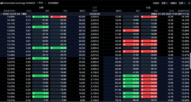 2025年2月份,黄金期权日均交易量(ADV)为11.7万份合约,未平仓合约(01)反弹至超过 100万手。这一趋势也反映在黄金的隐含波动率(CVOL)上,该波动率一直呈上升趋势,3月份近期的飙升表明看涨情绪更强,随着市场不确定性的加剧以及地缘政治冲突,黄金波动风险依然较高。