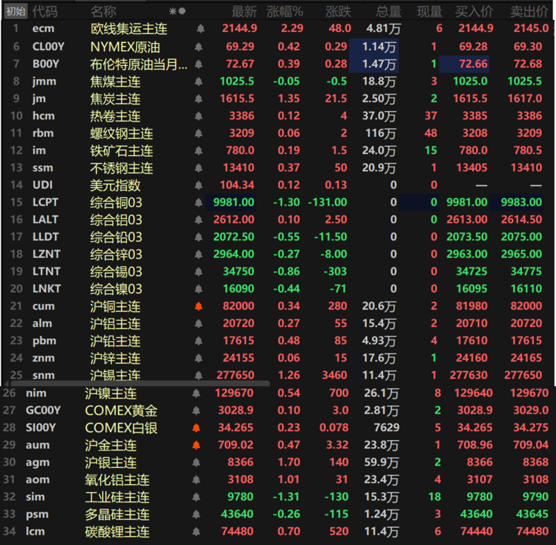 此外,碳酸锂主连涨0.7%,工业硅主连跌1.31%,多晶硅主连跌0.26%。欧线集运主连涨2.29%。