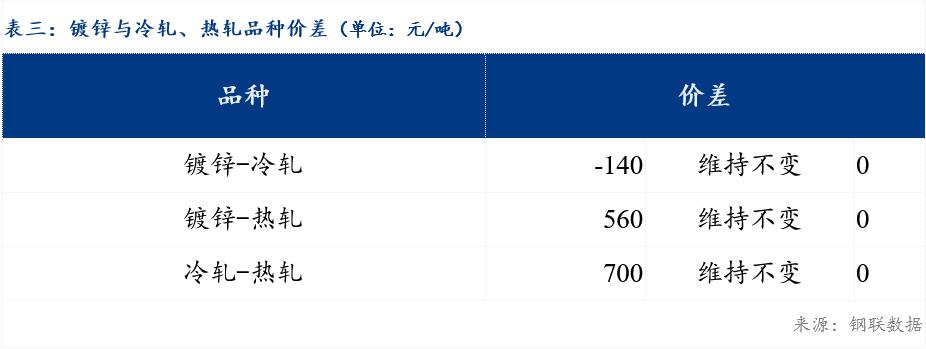 重庆、上海地区冷轧板卷区域价差维持不变,重庆、广州冷轧板卷区域价差扩大10元/吨;重庆、上海镀锌板卷区域价差扩大10元/吨,重庆、广州镀锌板卷区域价差维持不变。镀锌、冷轧品种价差维持不变;镀锌、热轧品种价维持不变;冷轧、热轧品种价差维持不变。