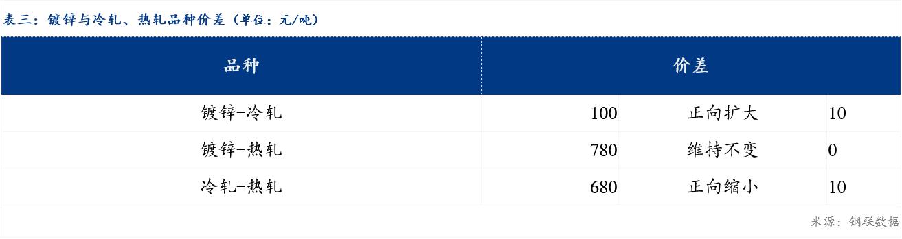 今日冷轧板卷乐从与天津价差较上一交易日收窄10元/吨,乐从与上海价差较上一交易日收窄10元/吨;镀锌板卷乐从与天津价差较上一交易日扩大20元/吨,与上海价差较上一交易日收窄10元/吨。品种价差方面,镀冷价差较上一交易扩大10元/吨,镀热价差较上一交易日持平,冷热价差较上一交易日收窄10元/吨。
