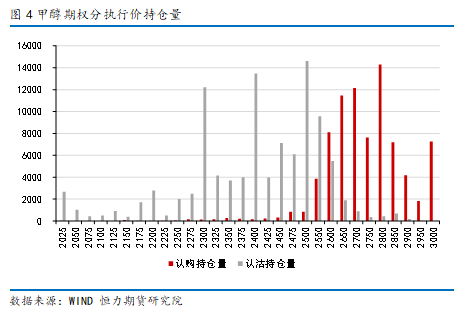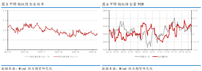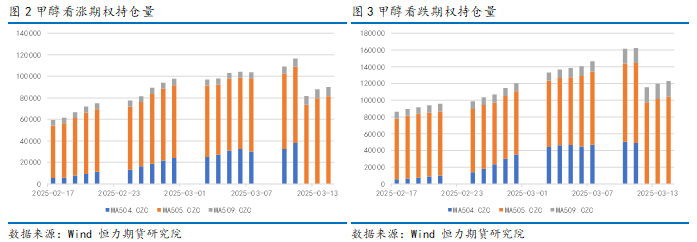 截至3/14日星期五收盘数据来看,看跌期权端持仓总量略高于看涨期权端持仓总量。看跌期权总量约为12.3万手,而看涨期权持仓总量虽然仅有9万手,但看涨期权主要集中在平值及浅虚值的几个行权挡位上,如2650、2700、2800,持仓量均超过1万手;而看跌期权的持仓量相对更分散,主要在浅虚值以及深度虚值的2500、2400、2300等几个整数位的行权价档位上,可看作备兑或保护策略入场所致。且对比已经到期的2504合约来看,前期强烈的看跌情绪略有缓和。当前可将2500看作甲醇05合约的强力支撑位,2650-2700看作压力位。
