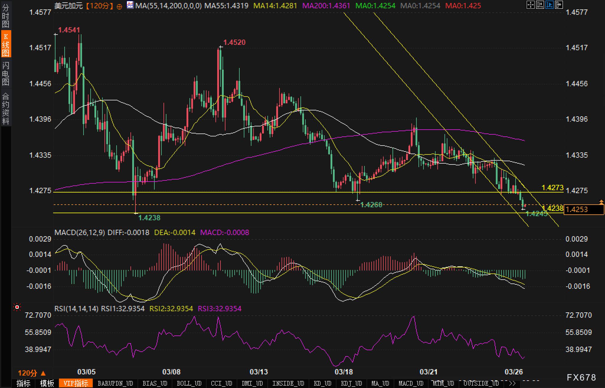 从短期角度看,油价坚挺及市场对加元的正面预期或将继续施压美元兑加元,若美国公布的耐用品订单及PCE数据再度不及预期,则可能加速汇价下探1.4200甚至1.4138区域。然而,如果4月2日前的政策消息出现缓和,且美国关键经济数据意外向好,美元的避险属性或再度走强,短线反弹也不容忽视。