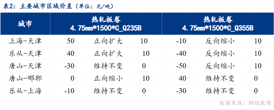 从区域价差来看,4.75mm普卷华南与华北价差50元/吨,华东与华北价差40元/吨,华南与华东价差-10元/吨。京津冀地区价差来看,唐山与天津价差-30元/吨,唐山与邯郸价差0元/吨 。