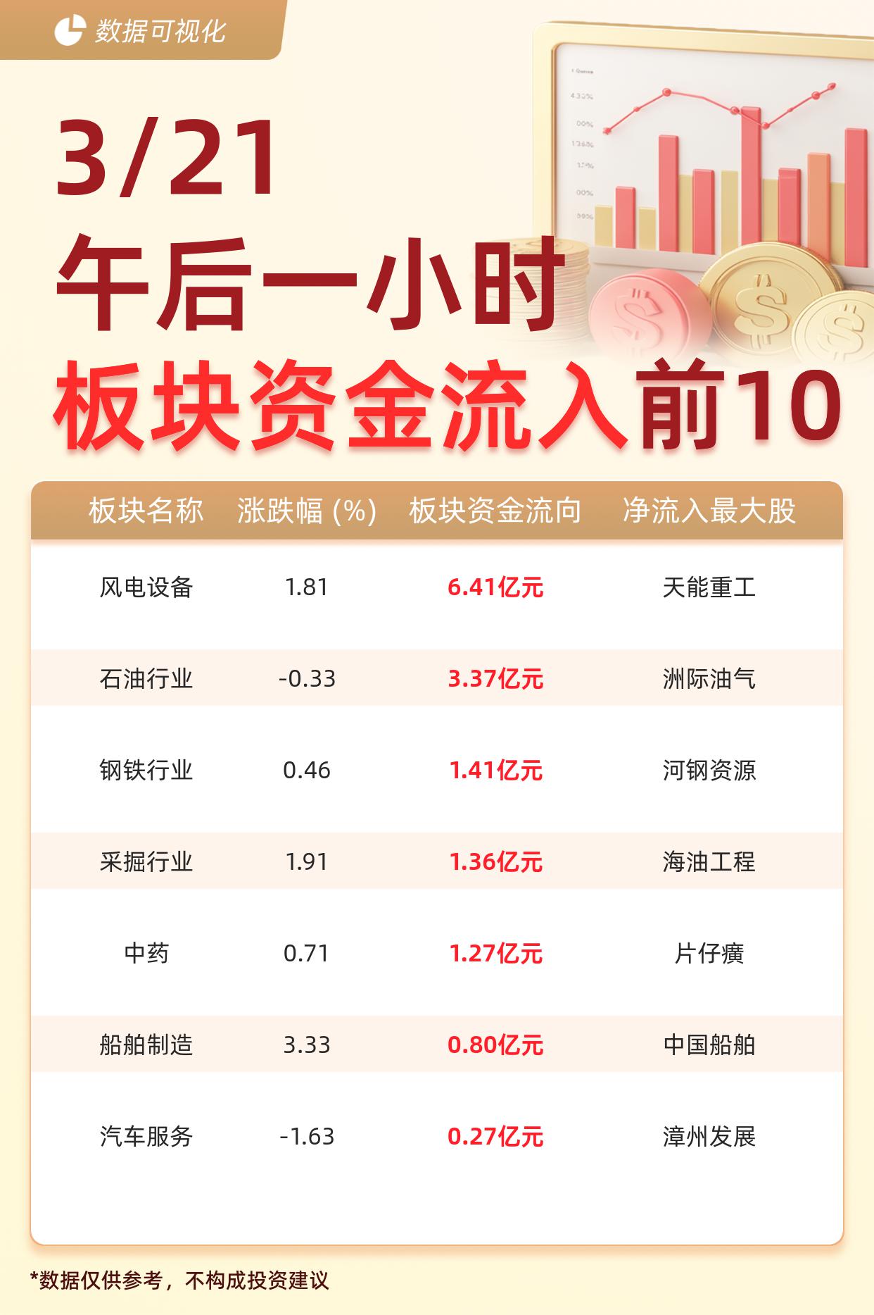 主力板块资金流入前10:风电设备流入6.41亿元、石油行业流入3.37亿元