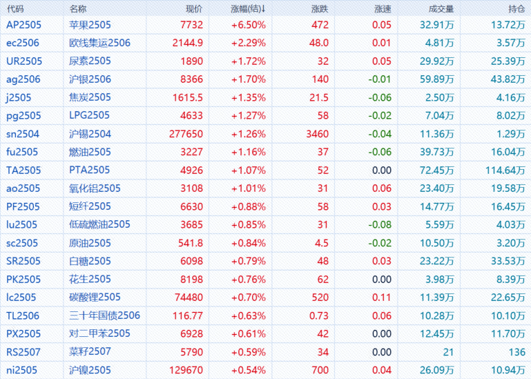 3月26日,午盘收盘,国内期货主力合约涨跌不一。苹果涨超6%,集运欧线涨超2%,沪银、尿素、焦炭、沪锡、液化石油气(LPG)涨超1%;跌幅方面,20号胶、豆粕、橡胶、工业硅、豆二跌超1%。