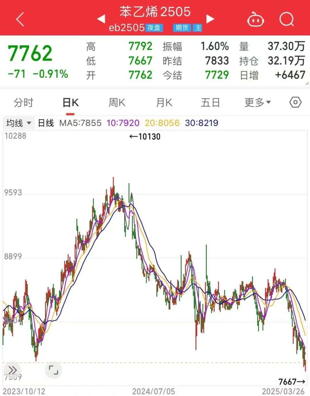 自2月下旬以来,苯乙烯期货价格重心持续下移,不断创下阶段性新低。昨日,苯乙烯期货价格创近一年半新低。