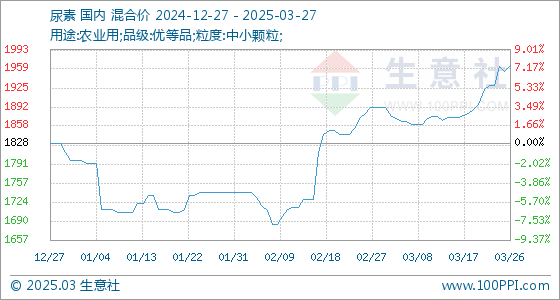 3月27日,生意社尿素基准价为1965.00元/吨,与本月初(1892.00元/吨)相比,上涨了3.86%。