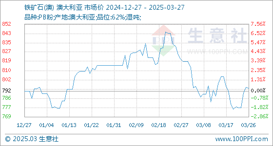 3月27日生意社铁矿石(澳)基准价为795.22元/吨