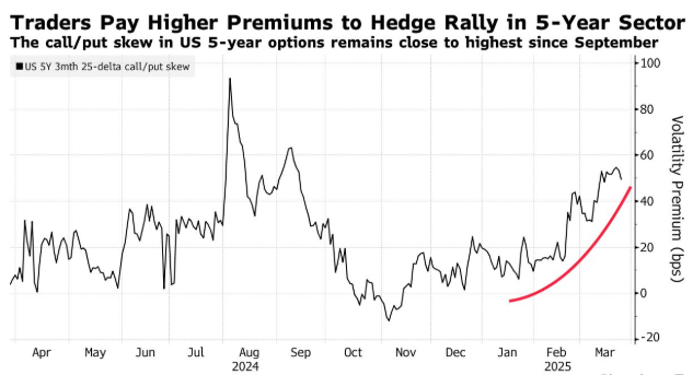 随着关税影响美联储的利率路径,以及围绕美国经济增长的担忧加剧,一种受欢迎的交易在美国国债市场上正在获得动力:购买5年期美国国债。在美国总统特朗普设定的4月2日征收关税的最后期限到来之前,期权市场显示,交易员倾向于持有5年后到期的美国国债敞口。这种高需求推动持有期权的额外成本升至去年9月以来的最高水平。