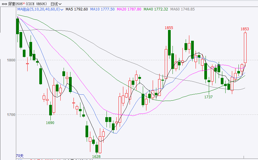 受现货主产销区尿素工厂出货向好,企业库存持续去库影响,尿素价格持续上行。今日涨势加速,主力合约价格接近最高价收盘,收1850元/吨,涨幅3.76%。