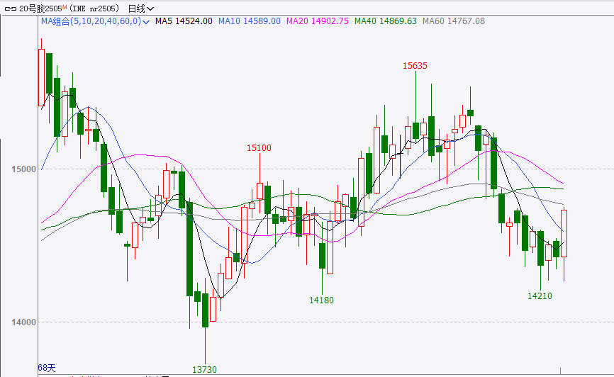 从3月初震荡下行以来,20号胶主力合约本月首次迎来较大幅度上涨,最终收盘价14730元/吨,收涨2.11%。