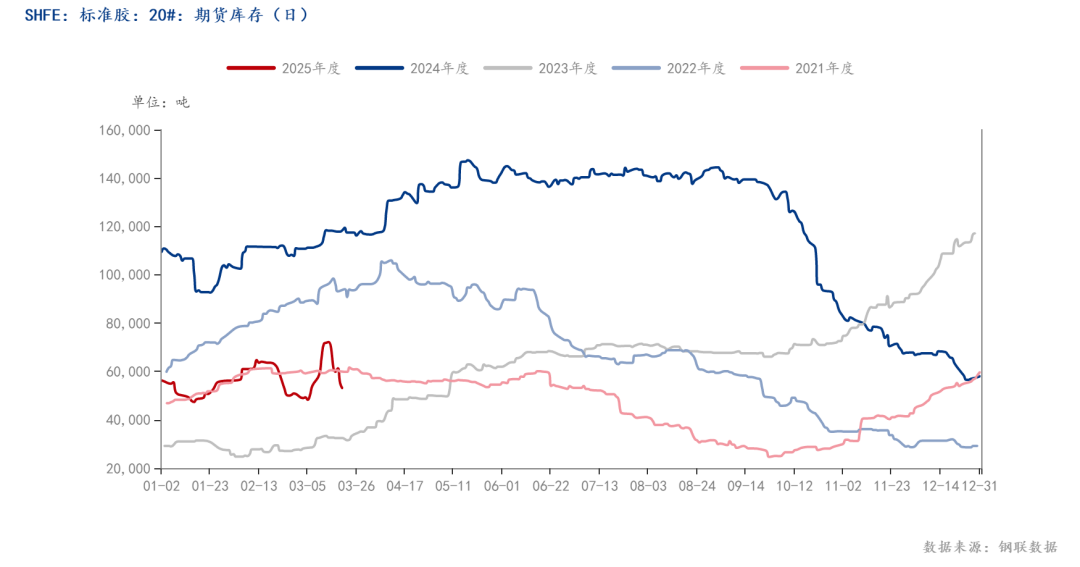 (3)库存端:至3月16日,天胶社库138万吨,环比增1.9万吨,增幅1.5%。其中,深色胶社库82.3万吨,环比增2.8%。至3月19日,20号胶交割库库存5.29万吨,环比上一交易日降0.22万吨。