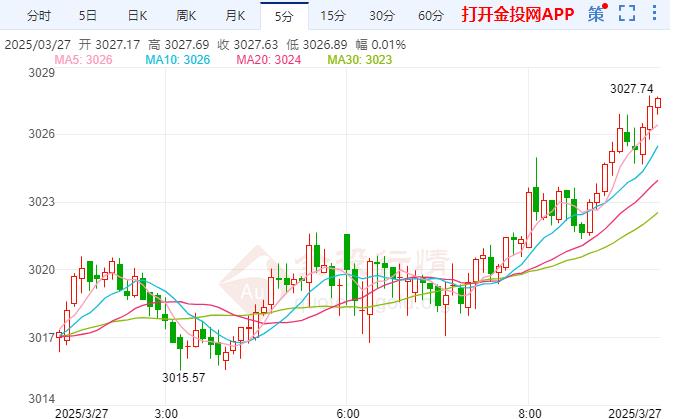 周三(3月25日)亚市早盘,现货黄金震荡上涨,目前交投于3026.70美元/盎司,涨幅0.24%,今日金价开盘于3019.21美元/盎司,最高上探3028.16美元/盎司,最低触及3016.79美元/盎司。