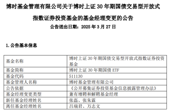 中国经济网北京3月27日讯今日,博时基金管理有限公司公告称,博时上证30年期国债ETF(511130)增聘基金经理张磊、张朱霖,吕瑞君、万志文离任。