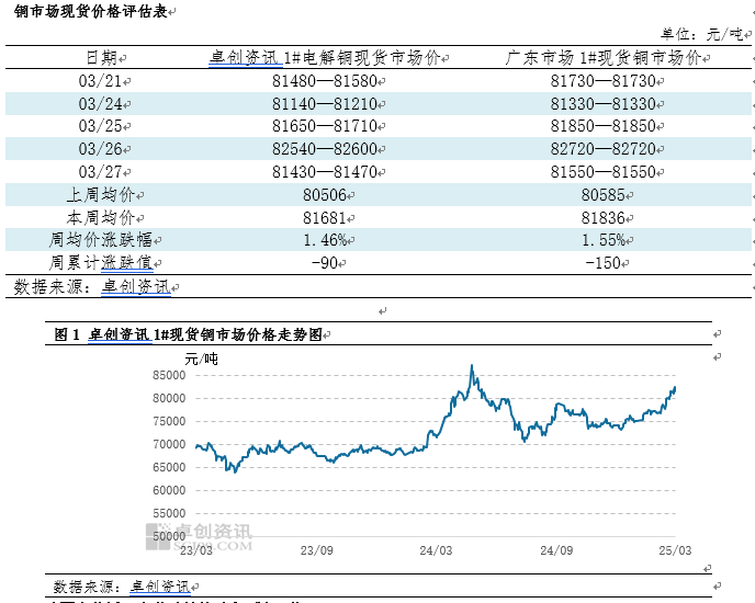 截至3月27日卓创资讯现货铜价在81450元/吨,较上期下跌90元/吨,跌幅为0.11%,周均价为81681元/吨,较上期环比涨幅1.46%。