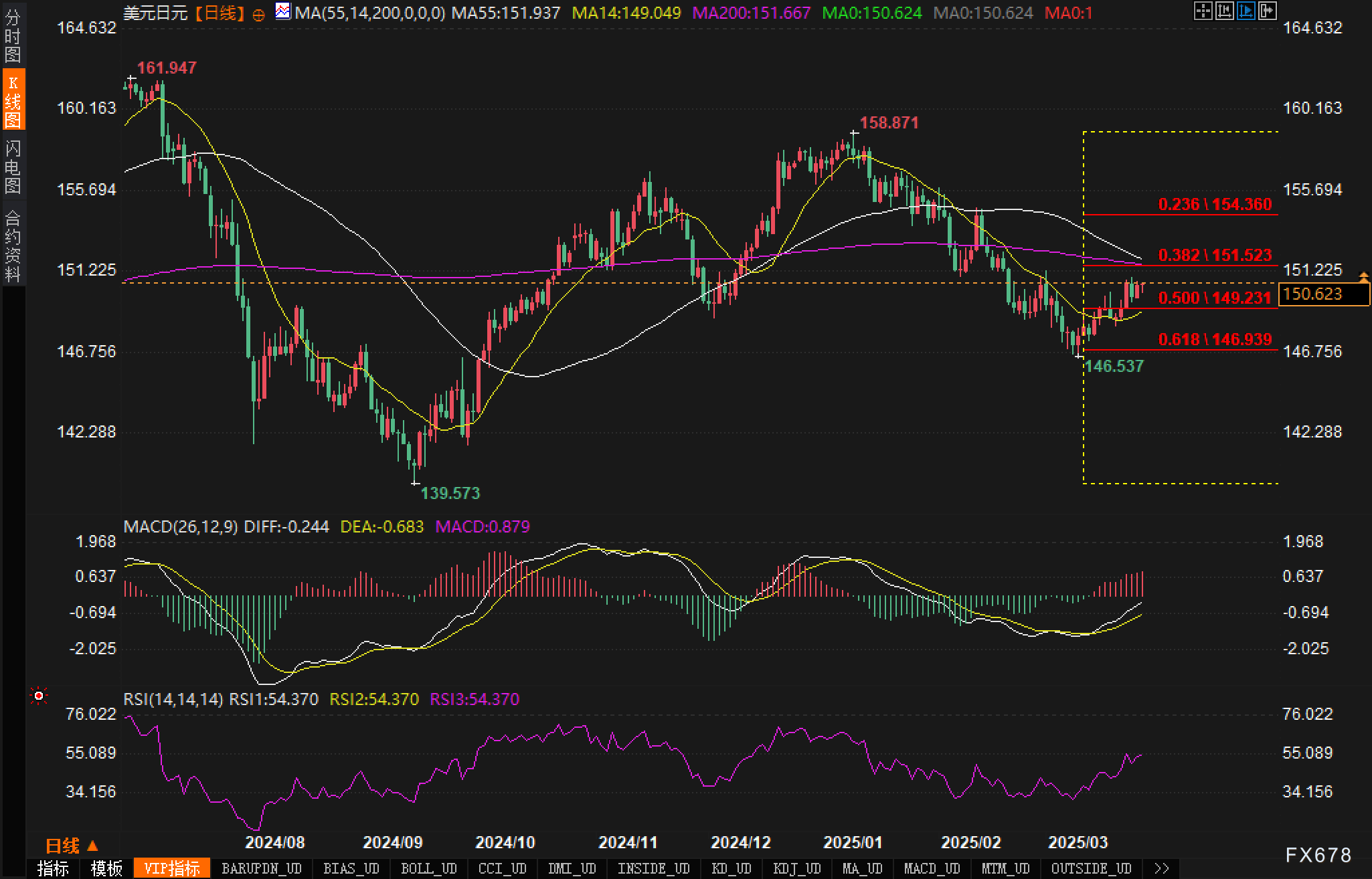 日线图上,美元/日元在去年高点161附近受阻后,整体呈现明显回落,一度下探至146.537的近期低位。当前价格虽出现阶段性反弹,但上方斐波那契回撤关键阻力依次位于23.6%回撤位154.3、38.2%回撤位151.5区域。若汇价进一步上行,需关注其对200日均线(MA200约151.66)的突破有效性。MACD指标虽呈现一定的低位金叉迹象,但主线仍位于零轴下方,暗示整体下行趋势尚未完全逆转。RSI则在50附近徘徊,表明市场情绪仍偏谨慎,若后续放量突破151.3一线,则有望打开上行空间,否则不排除重测146.537低点的可能。