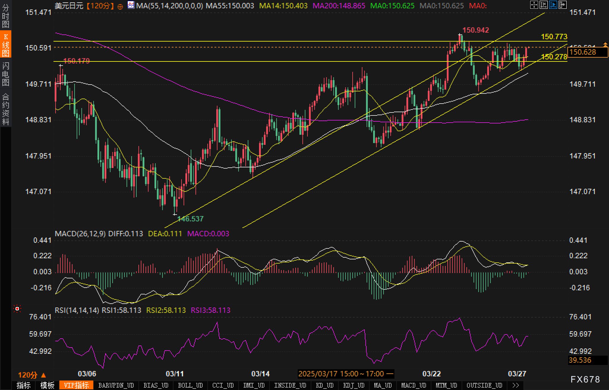 2小时图中,汇价近期呈现震荡上行并形成一条倾斜向上的通道,下方支撑在150.27-150.50区间,上方阻力则集中于150.77-150.94区域。从MACD来看,DIFF与DEA在零轴附近交织,动能柱变化不显著,表明短线趋势动力并不强。RSI位于58附近,略偏强势,但尚未进入超买区间,显示多空争夺相对均衡。若汇价能够带量突破150.94附近阻力,则有机会测试151.077一带;若无法企稳该区,则短期或陷入150关口至151区间的整理。