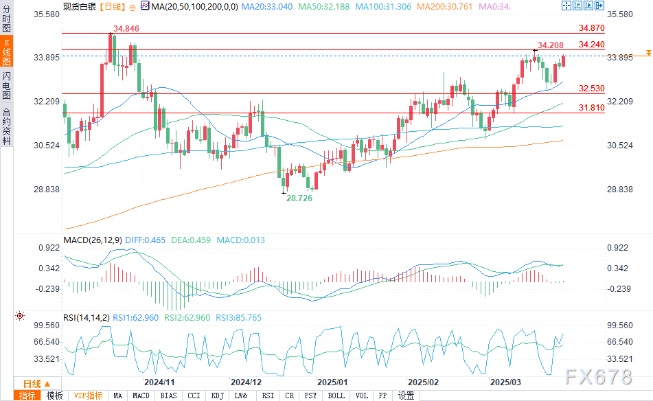 汇通财经APP讯——周四(3月27日)欧盘时段,白银盘中涨幅超过1%,价格突破34美元。随着宏观面和技术面支撑增强,多头将目标瞄准34.87美元。