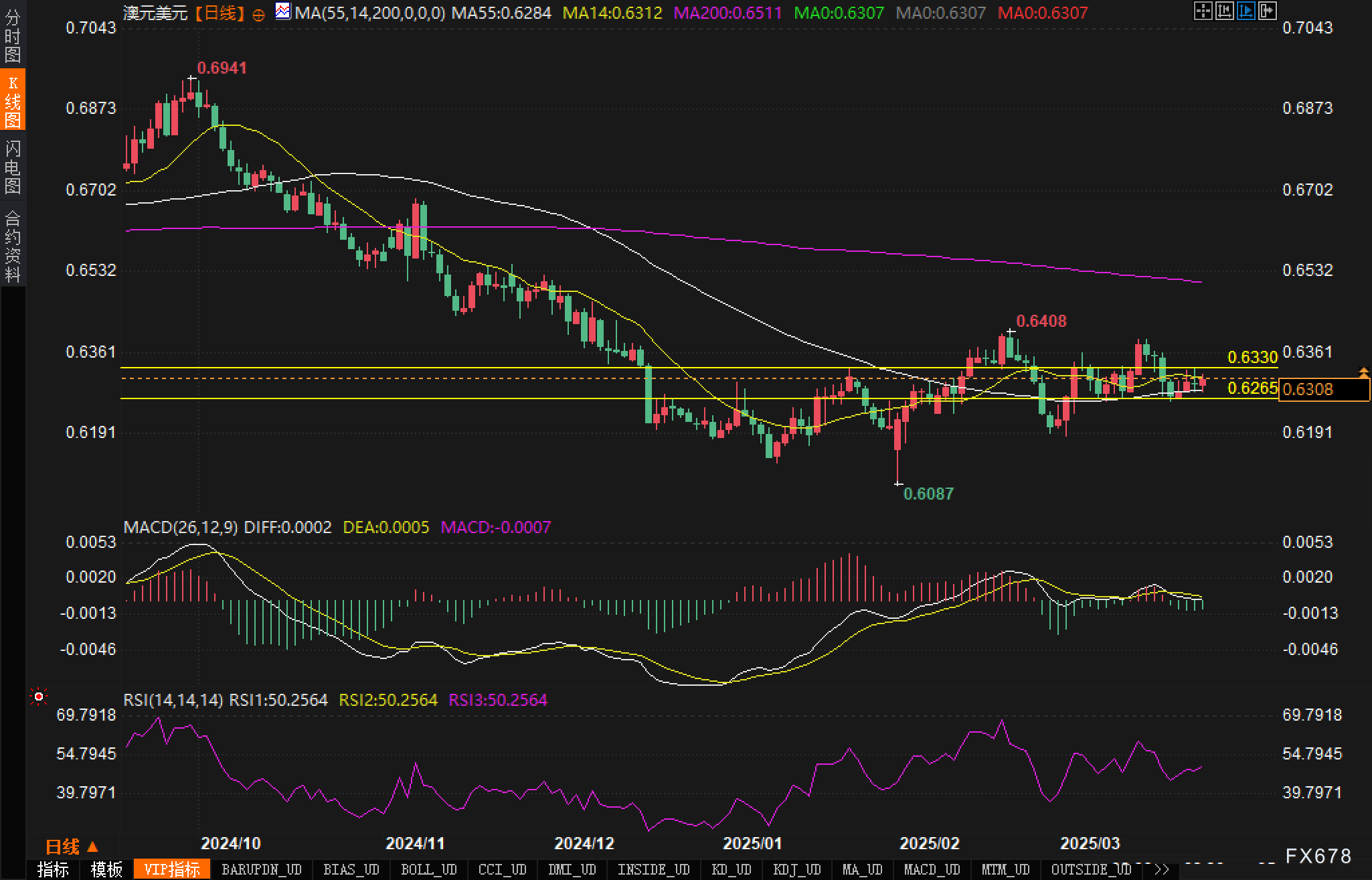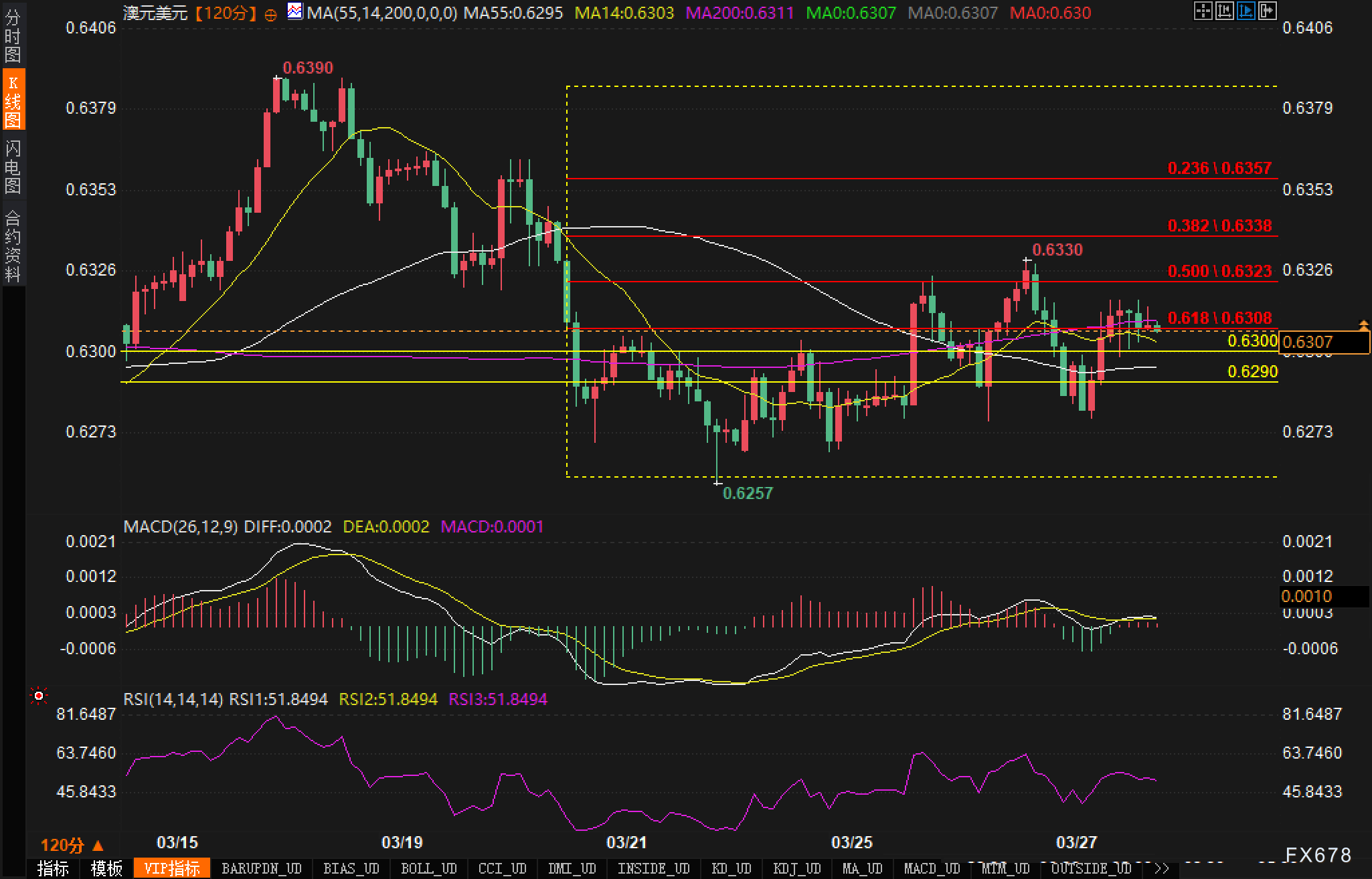 从120分钟图表来看,澳元兑美元汇价目前处于关键技术区间。K线围绕MA14(0.6303)和MA200(0.6311)两条均线展开震荡,这两条均线构成的狭窄区间已成为短期方向的决定区域。MACD指标显示DIFF线与DEA线呈现金叉状态,但金叉力度较弱,表明上行动能尚不充分。RSI指标位于51.84水平,处于中性区域,未显示明显超买或超卖信号。