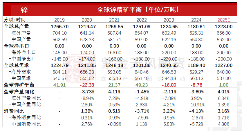 全球锌精矿平衡
