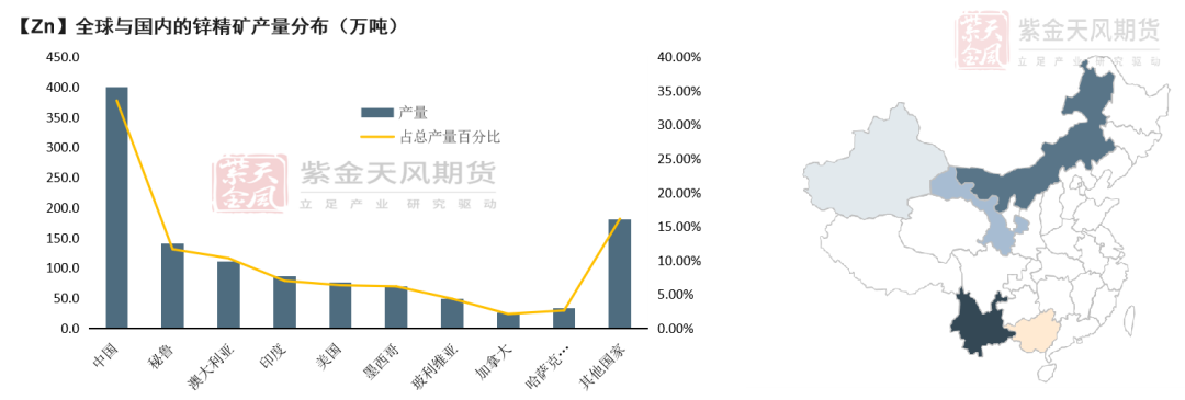 中国锌精矿的储量全球第二,但产量为全球首位,中国产量占比在30%以上。从锌矿规模来看,我国大型锌矿主要分布在内蒙古、云南、甘肃、广东、湖南等地。
