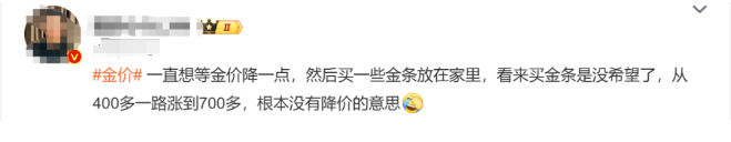 面对不断上涨的金价,网友也懵了。有网友称,“一直想等金价降一点,然后买一些金条放在家里,看来买金条是没希望了,从400多一路涨到700多,根本没有降价的意思。”“我高攀不起了”