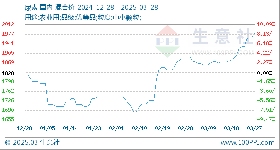 3月28日,生意社尿素基准价为1983.00元/吨,与本月初(1892.00元/吨)相比,上涨了4.81%。