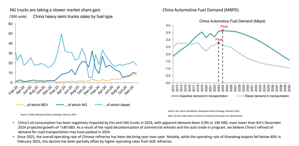 左图为天然气卡车市场份额增长速度放缓,右图为中国汽车燃料需求(百万桶 / 日)