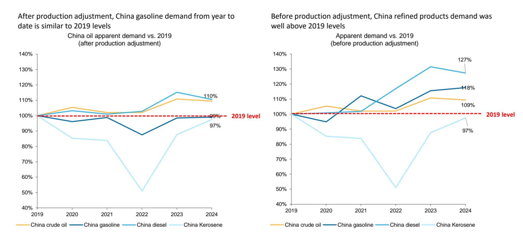 左图显示生产调整后,中国年初至今的汽油需求与 2019 年水平相近; 右图显示生产调整前,中国成品油需求远高于 2019 年水平。