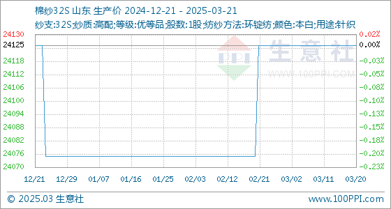 3月21日,生意社棉纱32S基准价为24125.00元/吨,与本月初持平。