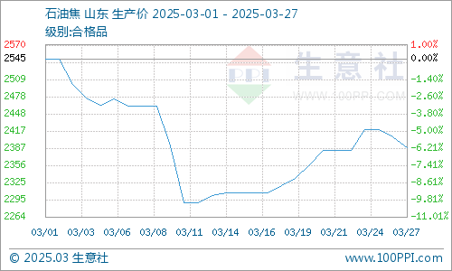 据生意社商品分析系统显示,本周地炼石油焦行情先涨后跌,整体小幅上涨,截止到3月27日山东市场地炼石油焦价格为2387.50元/吨,较3月21日2382.50元/吨上涨0.21%。