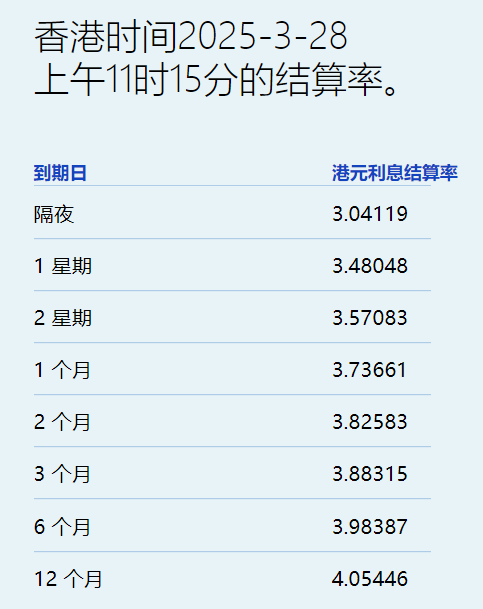 港3月28日,港元拆息持续偏软,与楼按相关的一个月拆息两连跌,报3.73661%,为2月14日后最低,一周拆息中止三连升,报3.48048%,但隔夜息反弹32基点至3.04119%,见逾两周新高。反映银行资金成本的三个月拆息连跌两天,报3.88315%,为3月18日后最低,六个月及一年期分别降至3.98387%和4.05446%。