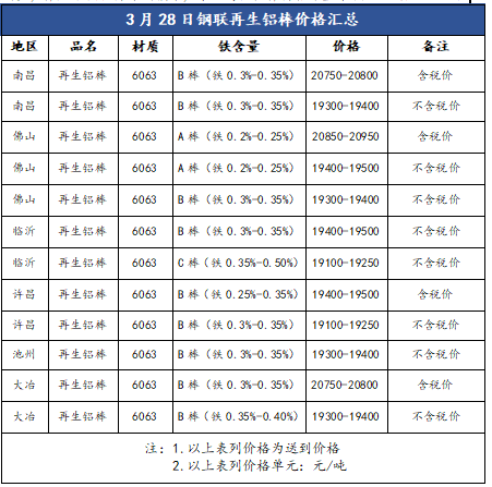 3月28日A00铝锭现货价华东20620,跌190;华南20580,跌200;中原20540,跌170(单位:元/吨)。废铝原料供应偏紧,市场再生铝棒现货流通量偏少,棒厂小幅挺价保利接单,今日再生铝棒价格跟盘下跌100元/吨左右。
