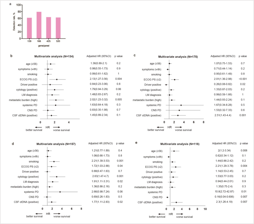脑脊液 ctDNA 阳性检测与较短的总生存期(OS)独立相关(HR=1.9,95%CI=1.56–2.39,P<0.0001)。其中,燃石医学朗清 -168基因panel和OncoCompass Plus-520基因panel检测的脑脊液ctDNA阳性患者预测预后性能最优(HR = 2.51和2.3)。这表明脑脊液 ctDNA 检测能够独立预测患者的预后,为临床医生提供了一个重要的预后评估工具。