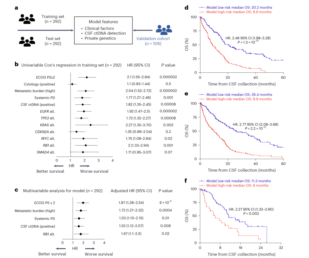 基于脑脊液 ctDNA 检测结果和临床特征,研究团队开发了一个多指标预后模型,综合考虑了RB1改变、脑脊液 ctDNA 状态、东部肿瘤协作组表现状态(ECOG PS)、转移负担和系统性进展等多个因素。该模型能够将患者分为高风险和低风险组,高风险患者的总生存期明显少于低风险患者(HR=2.48,95%CI=1.88-3.28,P<0.001)。这一多指标预后模型在独立验证队列中也得到了一致的验证结果(HR=2.27, 95%CI=1.32–3.9,P=0.002)。