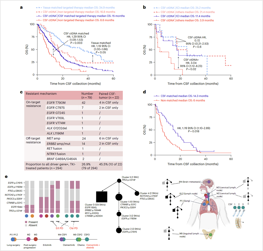 在连续监测的122例患者(≥2次脑脊液检测)发现,治疗压力下新出现的CNS特异性克隆,如EGFR C797S,也可通过ctDNA实时捕获。这种纵向监测能力显著改善了患者的生存结果(HR=0.56,95% CI=0.35–0.91,P=0.018)。