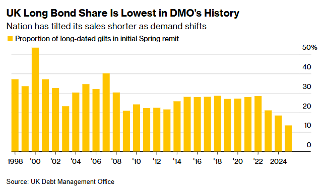 这一转变加速了过去几年的发债策略趋势。随着固定收益养老基金(传统上通过持续买入支撑市场)需求减弱,DMO的调整幅度甚至超出所有市场预期。