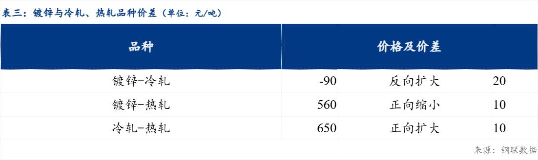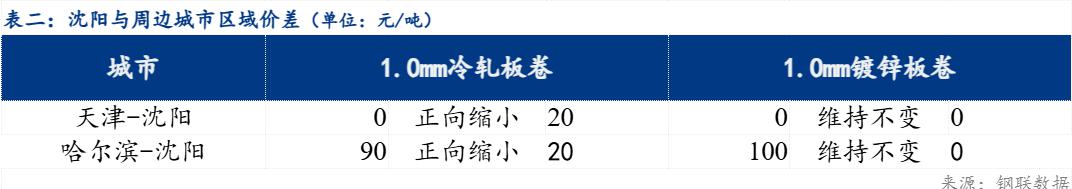 区域价差来看,天津-沈阳冷轧板卷区域价差缩小20元/吨,沈阳-哈尔滨冷轧板卷区域价差缩小20元/吨;天津-沈阳镀锌板卷区域价差维持不变,沈阳-哈尔滨镀锌板卷区域价差维持不变。品种价差来看,镀冷品种价差维持扩大20元/吨 ;镀热品种价差缩小10元/吨;冷热品种价差扩大10元/吨。