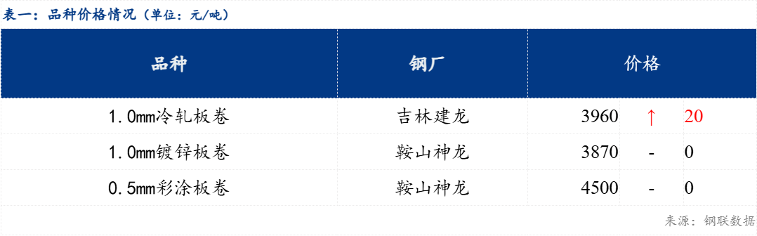 沈阳市场冷轧镀锌价格持稳运行,现东北主流市场冷轧板卷价格3960元/吨,较昨日上涨20元/吨,镀锌板卷价格3850元/吨,彩涂板卷价格4550元/吨。具体来看,市场方面,今日热卷期货盘面偏强运行,冷轧市场价格上涨,贸易商手头库存偏低,但是下游需求不足。心态方面,目前市场需求恢复持续性不强,贸易商仍持谨慎观望态度为主。综合来看,预计下周交易日东北市场冷轧及镀锌板卷价格或以稳为主。